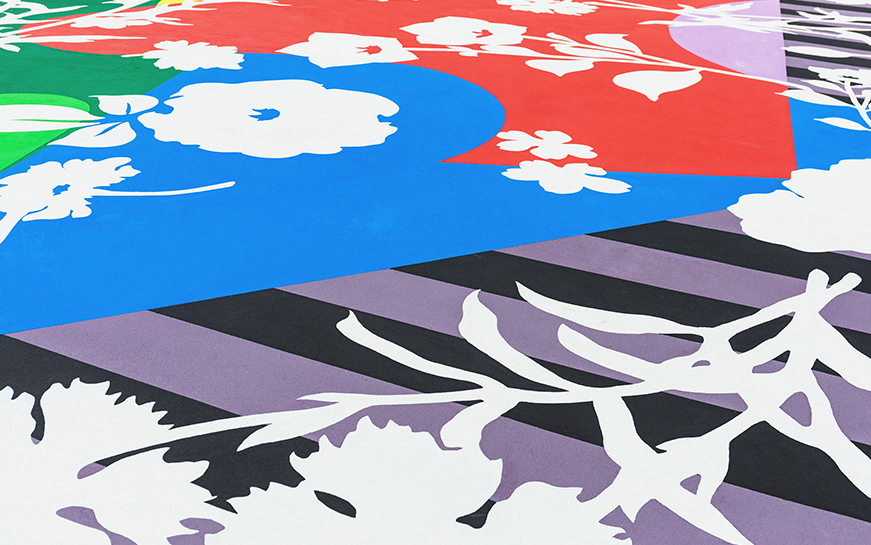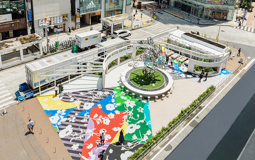 地面にはカラフルな植物の装飾柄を交えたランドスケープが描かれていたり、中央の彫刻にも植物をモチーフにした装飾柄があったり。都会のなかにすごく人工的なアート・オアシスみたいなものをつくることによって、訪れる人をドキドキさせたいと考えました。