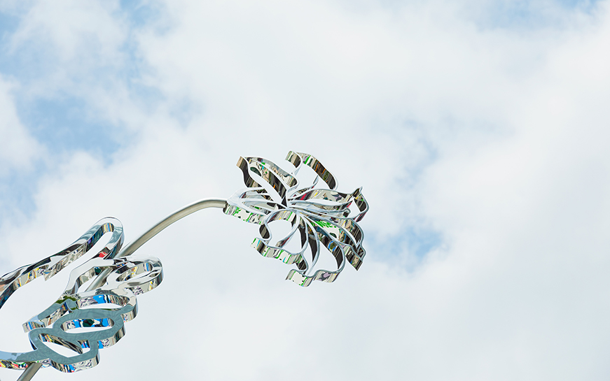 彫刻は、花の尾っぽがついているような形状をしていることもあり「花尾」というタイトルにしました。彫刻の下にあるキャプションは、漢字で「花尾」としているんですが、その下の英語は「Hanao-san」。あえて“さん”をつけているんです。日本って、モヤイ像とかハチ公とか、呼びやすい名前をつけることでアイコニックな待ち合わせ場所になることが多いですよね。それらと同じように、この彫刻も「花尾さんの前に集合ね」というふうに定着してくれたら。