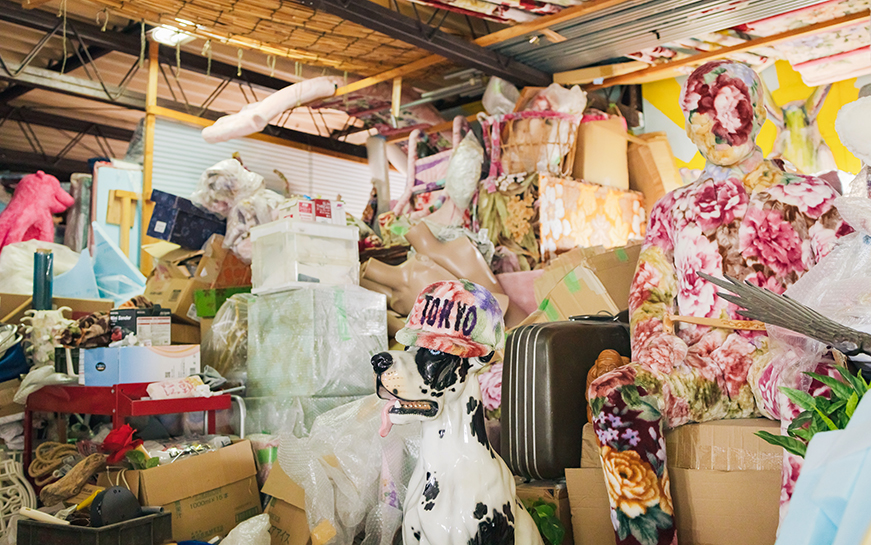 過去の作品や花柄毛布などの素材があふれる江頭さんのアトリエ