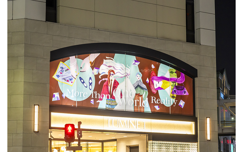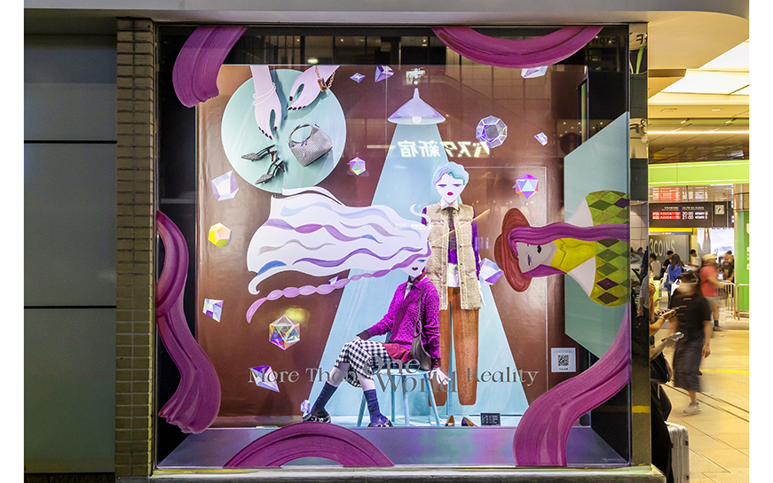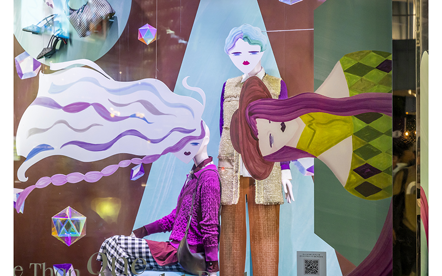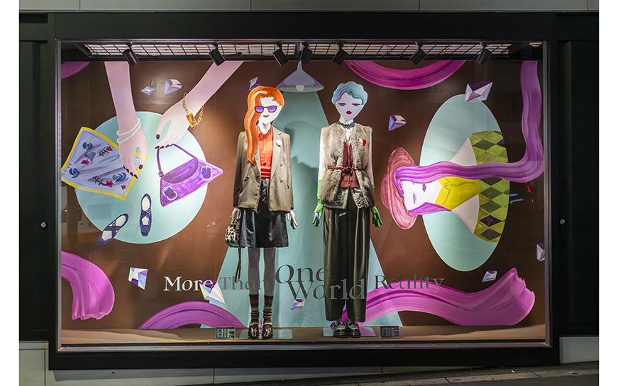 さらにもうひとつ、制作チームがキーワードに据えたのが“多次元世界”です。文化や民族、性別をはじめ、時間の概念さえも自身の感性でミックスし、新たな未来を紡ぎ出す。そんな世界観を表現するために「マネキンの一部に平面のイラストを組み合わせたり、上部から吊るされた多面体にホログラムペーパーを使って光の反射や映り込みを生かしたりしています」と作永さん。「二次元と三次元が交差する、世界線が曖昧な多次元世界をつくり出したいと考えました」と話しました。