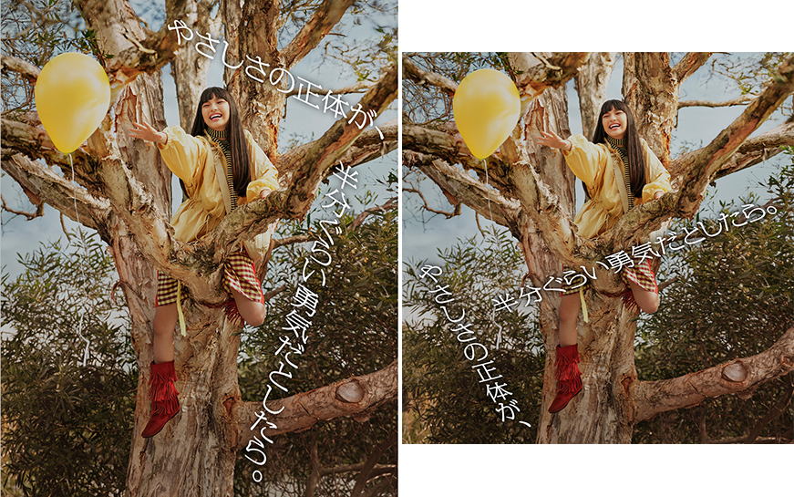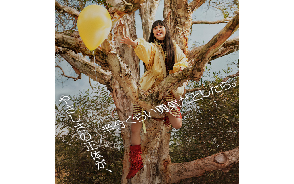 ビジュアルで描かれているのは、木に登り、誰かが飛ばしてしまった風船に果敢に手を伸ばす女の子。モデルを務める女優の中西希亜良さんの一生懸命な表情と勇気ある行動に、思わず応援したくなってしまいます。スーパーヒーローのような大活躍はできなくても、自分の手の届く範囲で動き出すことで、世界を少しでもよくしていけたら。それが自分以外の誰かのためであれば、なおさら意義深いものになるはずです。