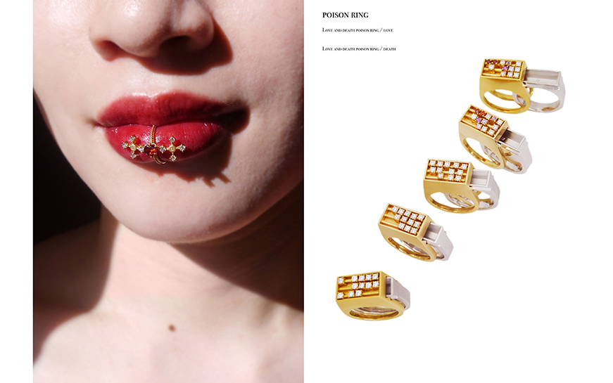 スズキさんが手がけるジュエリーブランド「eimiess」。写真のリップリングと指輪はコレクション「Murder in the Movie(=映画における殺人)」のアイテム。