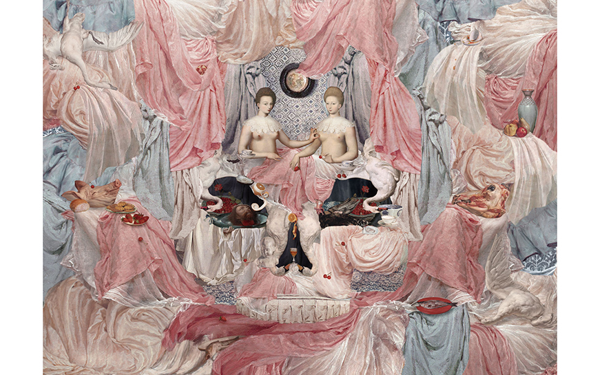 アーティストとしての活動のメインは平面作品の制作・発表です。古典美術の絵画を引用したコラージュにペインティングを施し、切り貼り感のあるものではなく、一枚の絵に見えるように仕上げています。