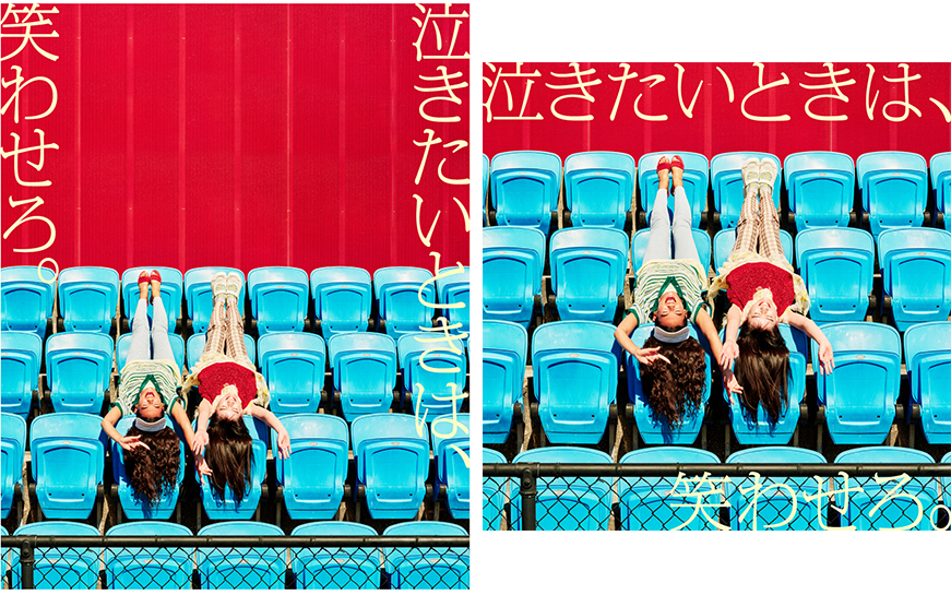 撮影はオーストラリア・シドニーで行われ、現地のフォトグラファーがシャッターを切りました。これまでのトーンとは一線を画す、ビビッドでコントラストの強い色彩。その力強いビジュアルと、「泣きたいときは、笑わせろ。」という潔いコピーが相まって、見る人の心をグッと引き寄せるインパクトを放っています。ムービーでは、音楽とテニスボールの動き、そしてふたりの動作がシンクロし、見るだけで心が躍るような、小気味よいリズムが刻まれています。