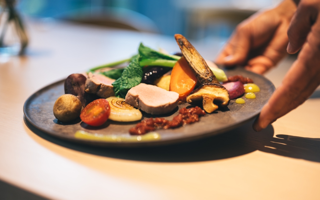 2階の「SLB THE DINING」は、季節の食材を活かした和洋ミックスの「ライスボウルランチ」や「ダイニングディナーコース」を堪能できるレストラン。健康に必要な栄養素をバランスよく摂れる献立「一汁三菜」をモダンに再構築したもので、コースといってもボリュームは控えめ。素材のうまみが凝縮されたおいしい料理をカジュアルに味わえるのが魅力だ。