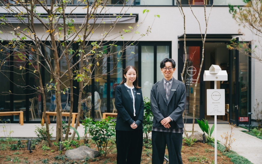 周囲にチェーン店が多い中、前庭の緑とコンパクトな木造の建物が一際(ひときわ)目を引く「ムスブルミネ」。右からルミネ大宮店 施設管理部の板東優介さん、営業部 グループリーダーの伊達奈央さん