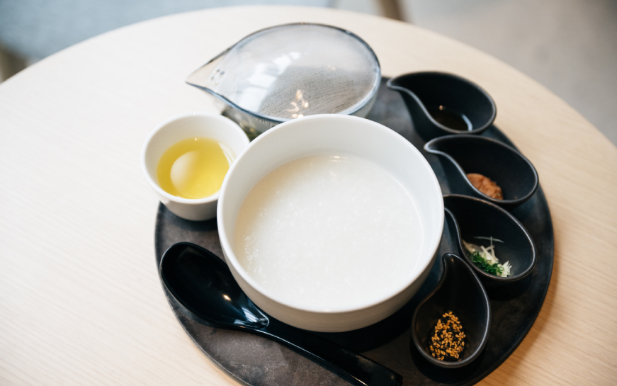 1階のカフェ「SLB CAFE」では、日本の主食である米をキーワードに、朝はお粥(かゆ)を用意。基本の「和風だし」に加え、蒸し鶏、トマトなどのカスタマイズも可能だ。