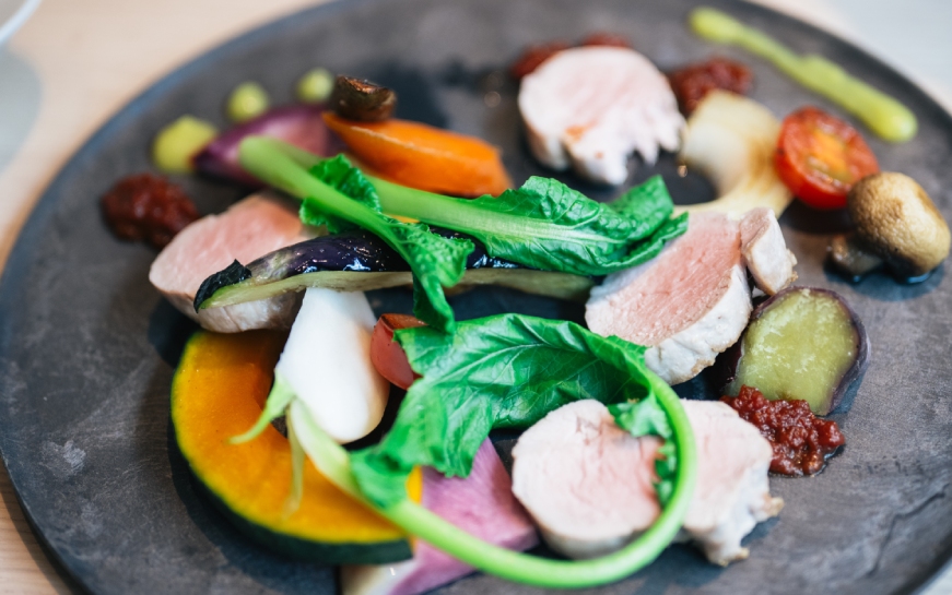 「サイボク豚ヒレのソテー ~トマトと醤油のソース~」は人気のメインディッシュ。豚ヒレは驚くほどに柔らかくクリアな味わい。グリル野菜もうまみが凝縮されていて美味。アラカルト(写真)でもオーダーできる