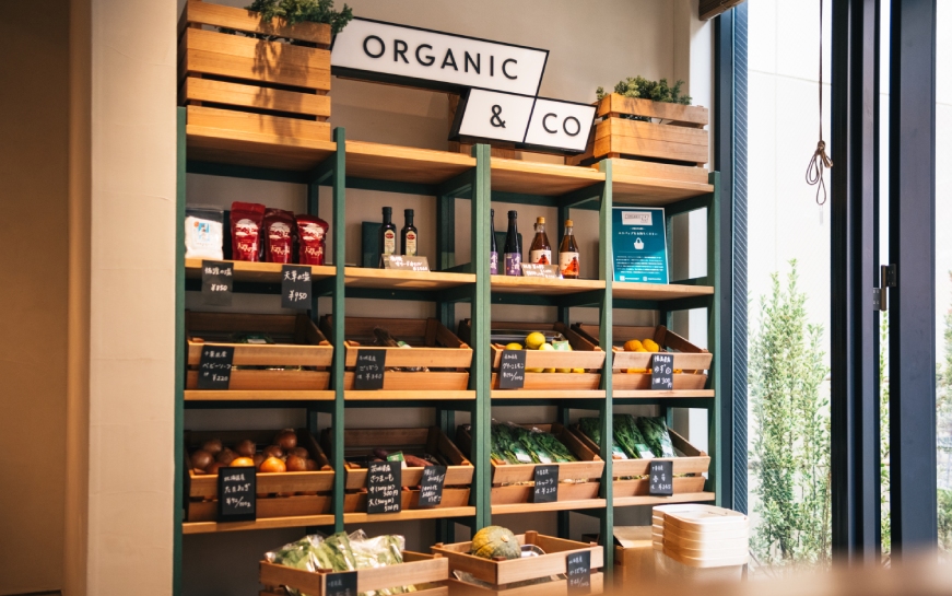 「ムスブルミネ」の入り口にある青果店「ORGANIC & CO.」。季節の新鮮な野菜や果物とこだわりの調味料が並ぶ