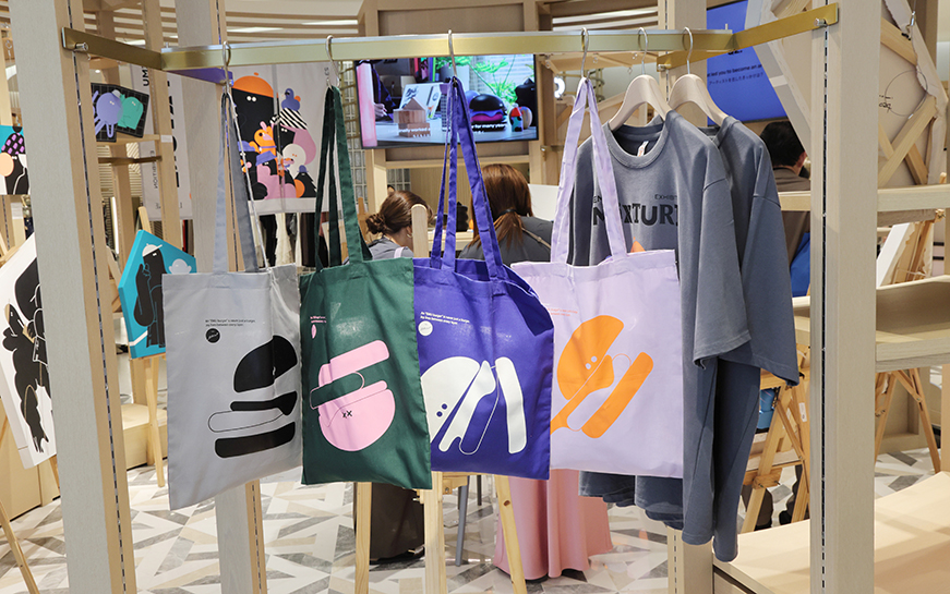 展示作品のかたわらには、Tシャツやトートバッグなどのオリジナルグッズも並びました。表面にEMUさんのイラスト、裏面にサインが入ったスケートボードは完売。スケボーアートが世界的なブームであることに加え、「住空間が限られているシンガポールでは、大きなアートより気軽に飾れる雑貨が馴染む」という現地ならではのニーズともマッチしました。それは、ルミネアートフェアが長年掲げてきた「アートを生活に取り入れる」というコンセプトが、海の向こうでも自然な形で受け入れられた瞬間でもありました。