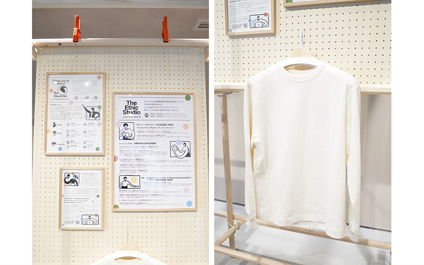 「雇用倫理」の展示では、ファッションブランド、アーバンリサーチのリサイクルコットンTシャツを通して生産者の思いに触れてもらう「The Ethic Studio」を展開。原料を提供している企業と、再生コットンを製作している企業、そしてTシャツを販売しているショップの三者へのインタビューを通して、それぞれの想いに触れることができます。