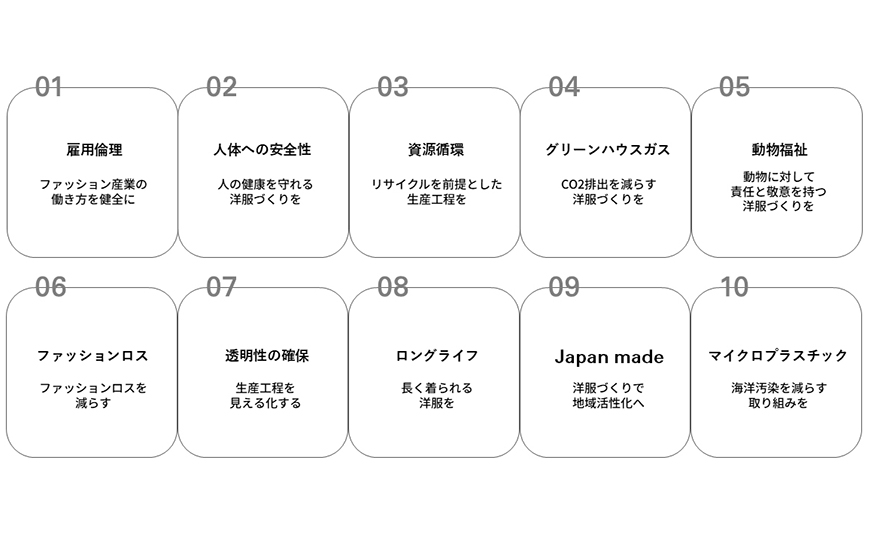 「SDGs研究の専門家をはじめ、金融機関やアパレルメーカーも参加する基準評価委員会を通して、認証基準項目は世界に通用するくらい厳格に策定しています」と大表さん。10項目すべてを満たすのではなく、項目を選べることでハードルを下げ、製品の特徴や付加価値をわかりやすく伝えることができます。