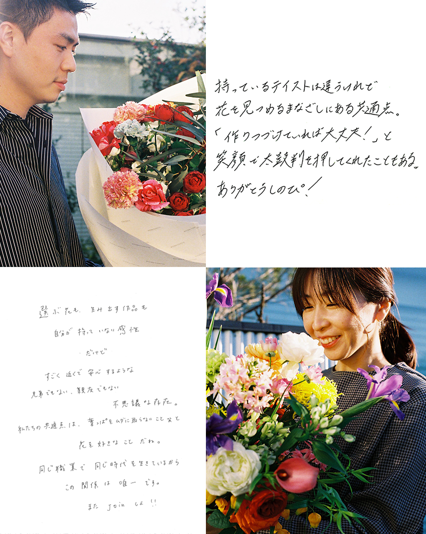 越智: たしかにいつの間にかですね。そもそも同業者と関わる機会がないので、しのぴー以外に花屋の友達はいません。選ぶ花もつくる花も全然違うんだけど、「花が一番」「花が主役」っていう気持ちを共有できる、唯一無二の人です。