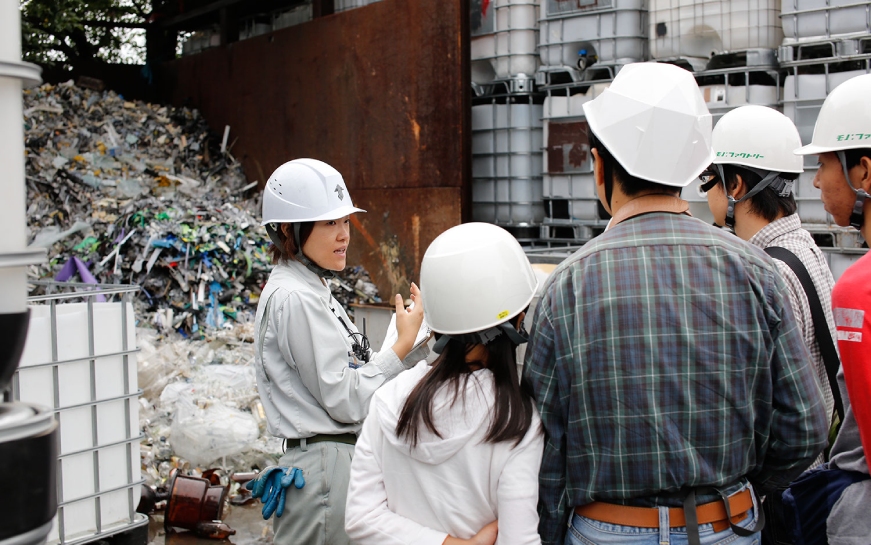 一般の見学者に工場を案内する河西さん。グループ全体の社員の4割が女性なのだとか。「廃棄物を細かく分別する作業など、女性の繊細な感性を生かせるシーンも意外と多いからか、自然と女性が増えていきました」