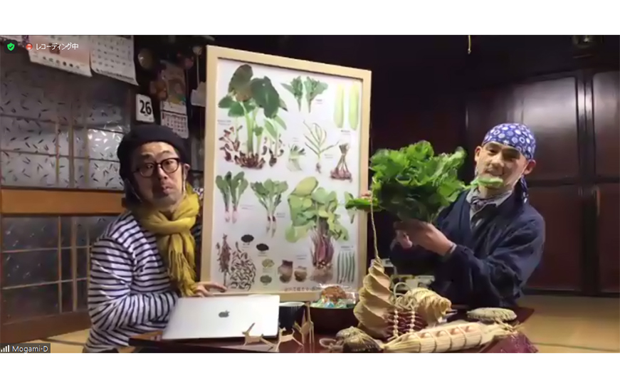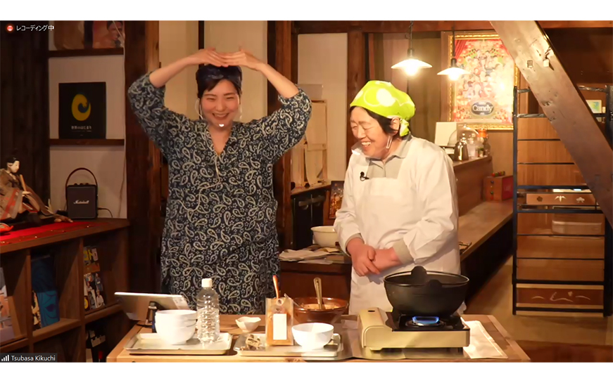 使用するのは、みさ子さんが育てた大豆で作った豆むすめという納豆、そしてここまでに開封した芋がら、玄米味噌、山菜の水煮。方言を交えながら繰り広げられるおふたりの軽妙な掛け合いに「みさこさんチャーミングだなあ」「すごい、癒やし系漫談から料理番組のようになった!」など参加者のコメントが飛び交います。