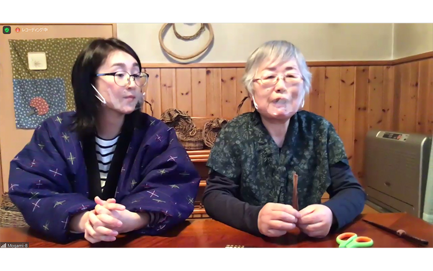 丁寧なレクチャーのもと、あっという間にかわいらしい箸留めができあがりました。参加者たちは画面ごしに見せ合い、「貴重な体験ありがとうございます」「かわいい!」とコメントを交わしました。「使い込むといい風合いになってくるので、ぜひ長く使ってください」と伊藤さん。あけびのつるで作ったカゴなども見せてもらい、自然の恵みに触れる時間となりました。