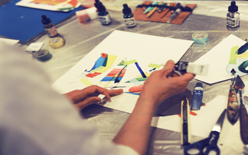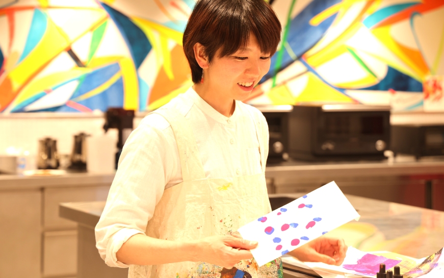 取材当日はワークショップを開催。チューブやスポイトや板などを使ってサッと線や面を描き、完成したかと思いきや、ハサミで切ってコラージュして、と即興の連続。端材からインスピレーションを受けることもある