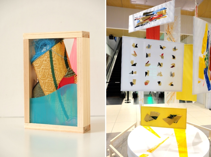 それは、内側に絵を描いた2枚の透明なアクリル板で丹後ちりめんの端切れを、空気を含ませるようにして挟みボックスに収納するというもの。布を平面ではなく立体的にコラージュし、そこにカラフルな絵を掛け合わせることで、丹後ちりめんの和装生地としてのイメージを覆すモダンな作品に仕上げた。あらかじめ作品のイメージを組み立てて、そこに素材を入れ込んでいくのではなく、まずは素材と向き合い、それからどんな作品をつくるかを練っていくという姿勢は、田中さんのものづくりの特徴のひとつでもある。
