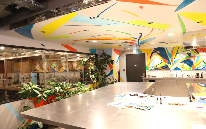 田中さんが壁画を手掛けた、有楽町のコワーキングコミュニティ「SAAI」のKitchen & DiningとTuning Room。Kitchen & Diningは発想が拡散するさまを表現した