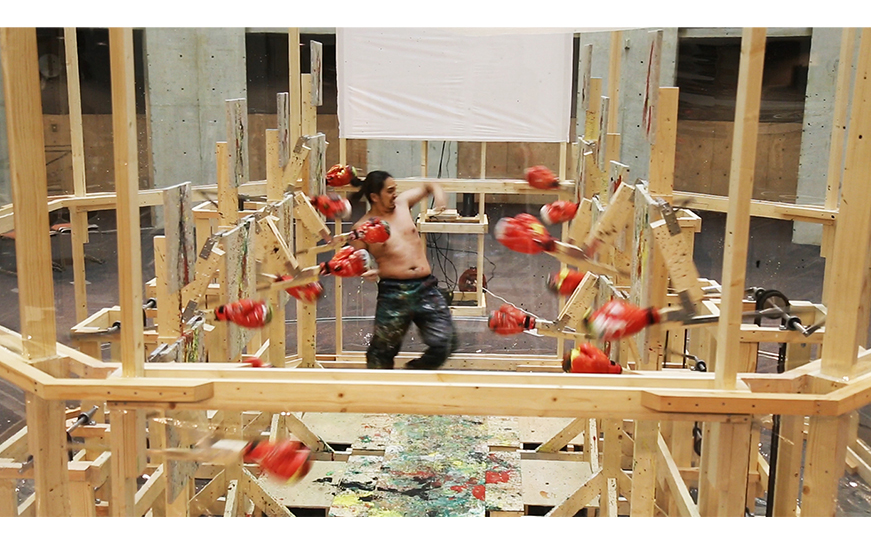 美大生時代からパフォーマンス作品を制作しています。たとえば、滋賀県にある近代まで土葬が残っていた地域のお寺の境内で、自分の髪を切りながら植えて“自己を培養する”ことをテーマとした作品。それから、ジャッキー・チェンの映画『少林寺木人拳』からヒントを得たパフォーマンスも行いました。自動で動くボクシンググローブを両脇に取り付けたキャンバスを向かい合わせに8台立て、僕がその間に立ってグローブをかわしながらキャンバスにアクションペインティングをする作品です。スクワットを100回することで描き上がる絵を、同時に102枚展示したこともありました。