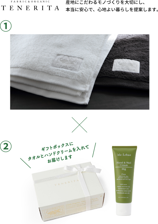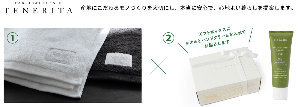 高品質なオーガニックコットン100%のタオルと、天然由来成分のみでつくられたハンド&ネイルクリームで、日々の暮らしをちょっと贅沢に。