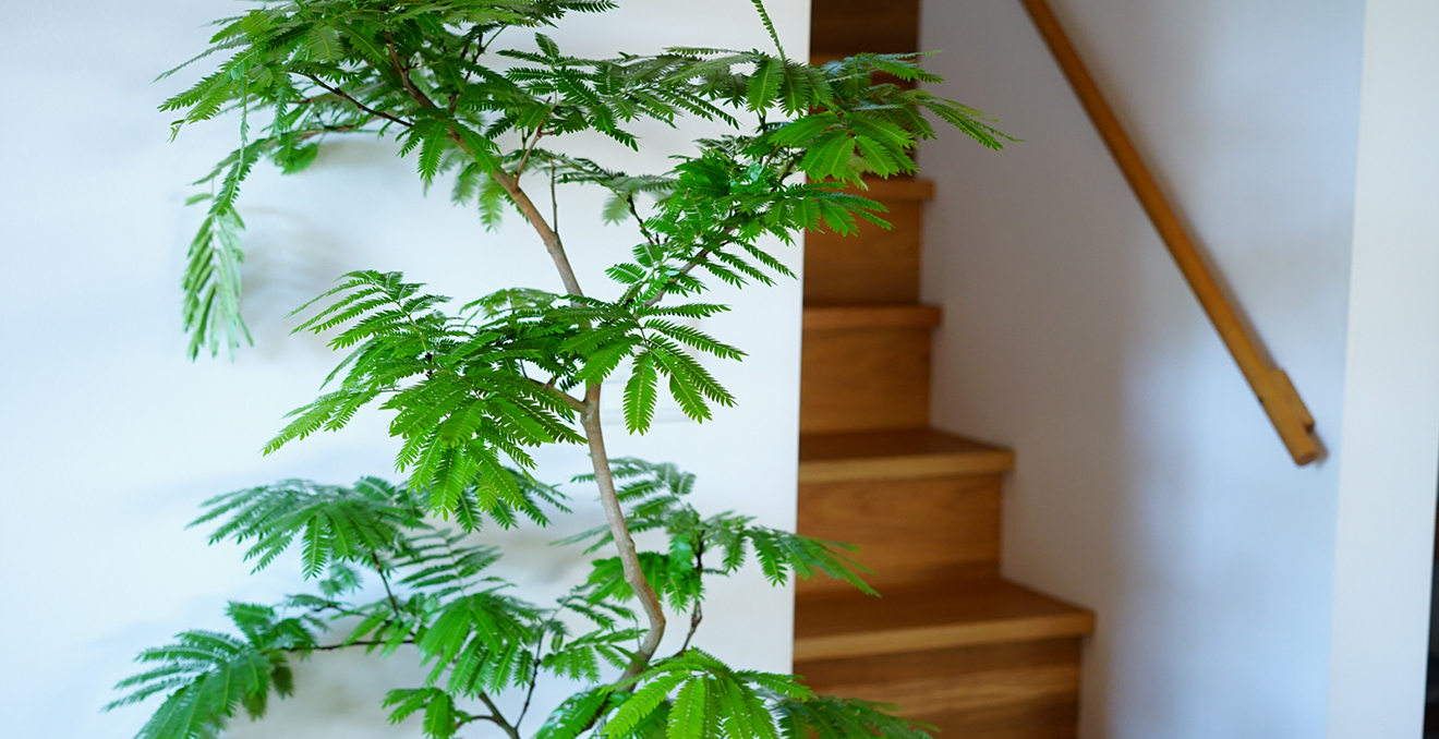 そんなときたまたまいい枝ぶりの、自分の身長くらいの高さがある観葉植物「エバーフレッシュ」に出会えたので、リビングに迎え入れました。