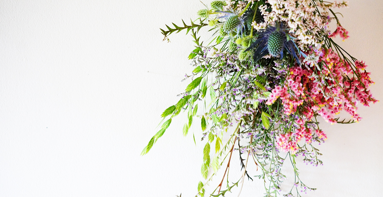 「スターチスはざっくり束ねてスワッグ(壁掛けの花束)に」