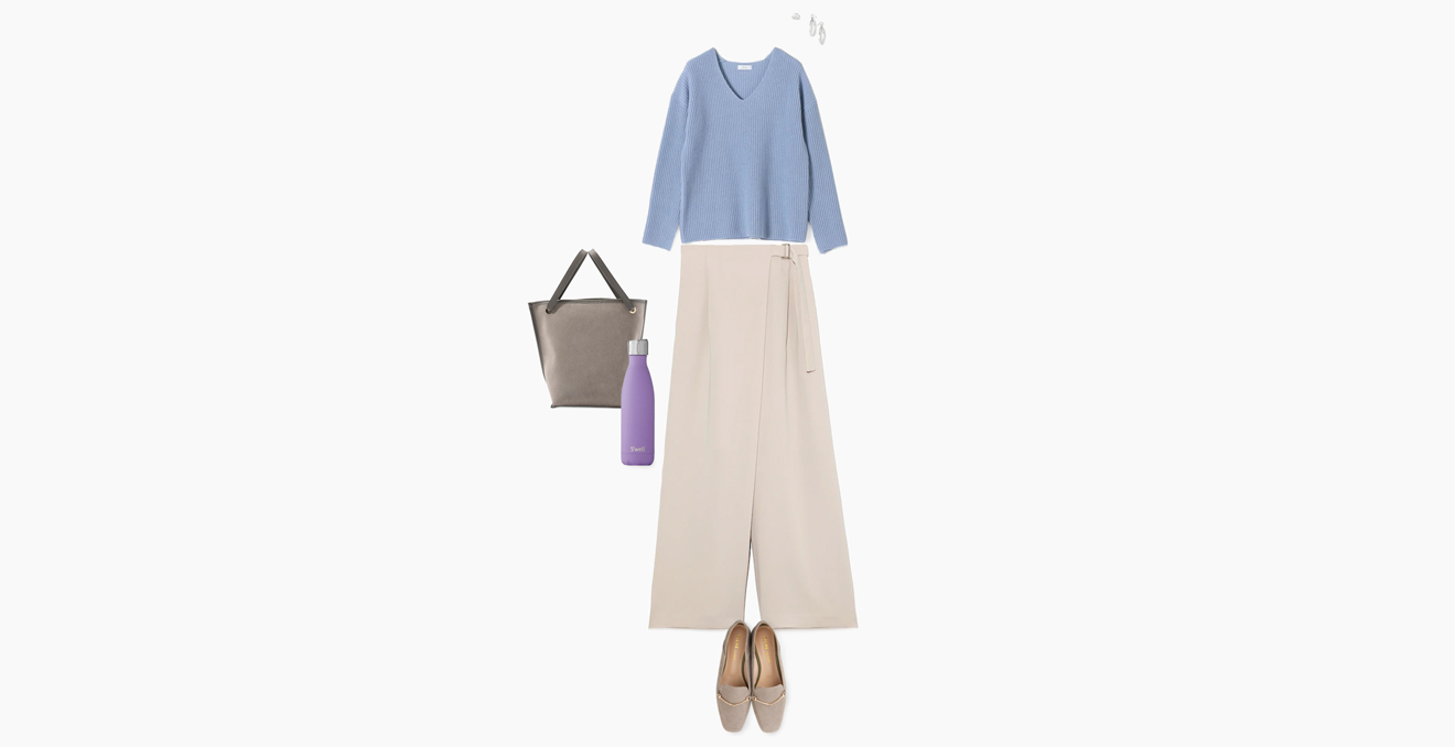 あと、ニットのセットアップも今年らしいアイテムのひとつ。セットで着るときちんと感もあるのに、体を締めつけないからリモートワーク中でもストレスフリーです。ロングシャツの下にニットパンツを重ねてワンマイルウェアっぽく着るのもいいですね。上に重ね着すれば秋冬を通して着られるので、この冬、ワードローブに買い足しアイテムとしてもおすすめですよ。