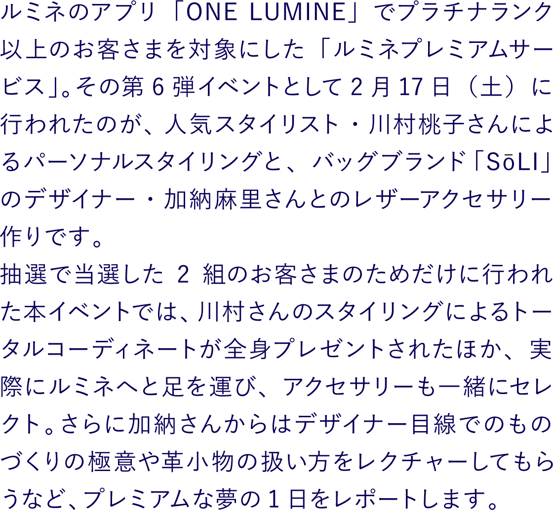 続いては今回のメインイベント、川村さんによるパーソナルスタイリングの模様をお伝えします。