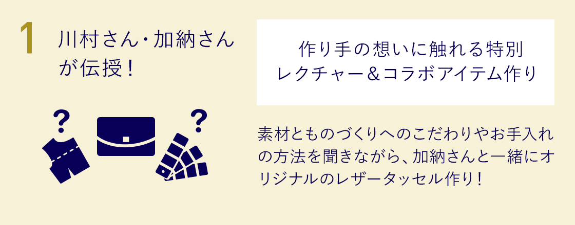 「今日は好きな色でオリジナルのレザータッセルを作っていただくのに加えて、グレージュのクラッチバッグも一緒にプレゼントさせていただきます!」(加納さん)