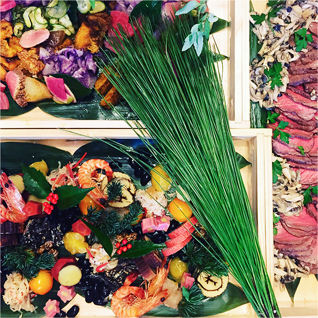 「色合いに関しては、緑とピンク、紫と黄色といった感じで、“反対色”を使うとコントラストが効いてかっこよくなりますね。また、食材の色が映えるようにMOMOEのケータリングでは必ず笹の葉を食材の下に敷いています」(稲垣さん)