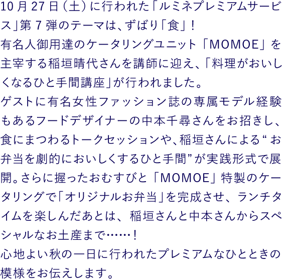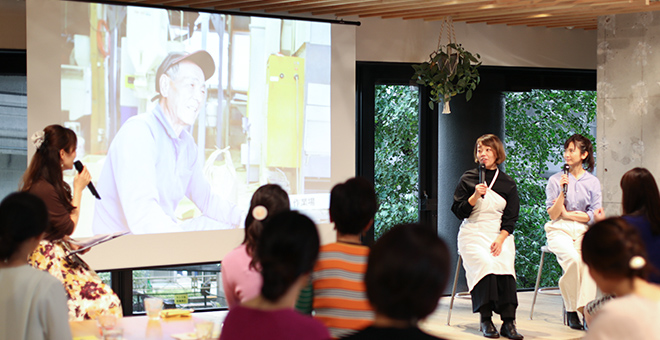 そして本日の講師である料理研究家、稲垣晴代さんとゲストの中本千尋さんが登場。早速、MOMOEのケータリングフードをスライドで紹介しながら、盛り付けや料理のひと手間を披露してくれました。