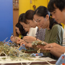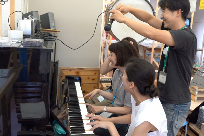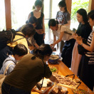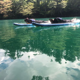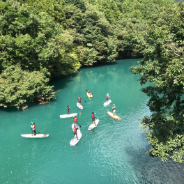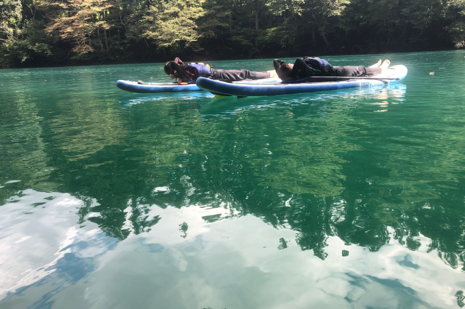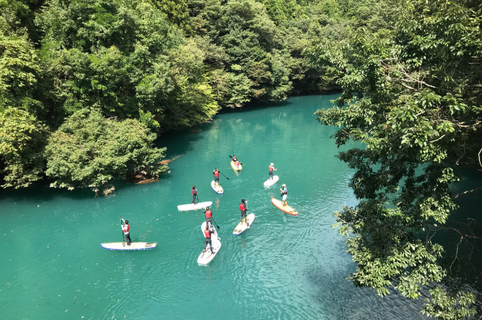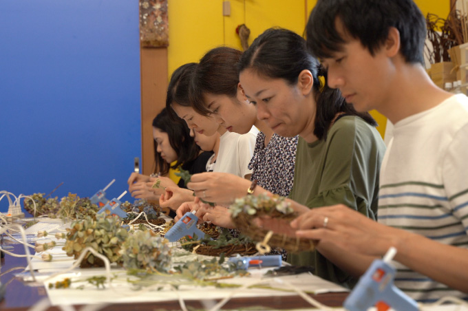 1泊2日は上野から特急列車にご乗車いただき中之条へ。駅では中之条町長をはじめ、地元のボランティアガイドさんや駅長がお待ちかね。皆でウェルカムランチ&乾杯をご経験いただいた後は、山重ディレクターによるガイドやアーティストとのワークショップを楽しみ、夜は四万温泉やまぐち館にご宿泊いただき、17:00には閉まるビエンナーレの会場である「旧第三小学校」をツアーのお客さま限定で開放し、ナイトツアーを開催。ビエンナーレキュレーターによるガイドもあり、移住アーティストとの懇親会と、盛りだくさんでした。2日目は「四万ブルー」で知られる四万湖でのSUP体験、古民家でのランチや中之条の特産であるお花を使ったリースづくりを体験。アート、食ももちろん、アクティビティからものづくりまで楽しむ2日間でした。