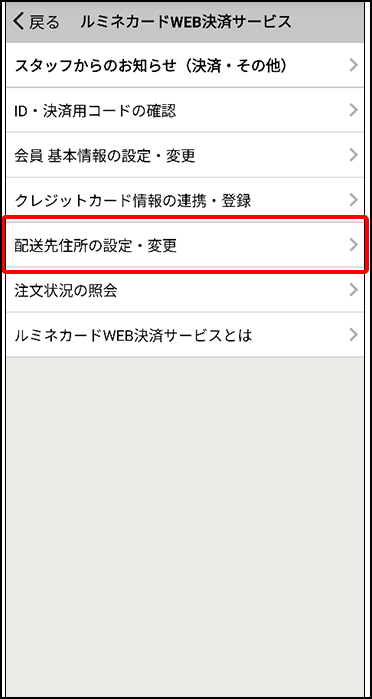 「配送先住所の設定・変更」をタップし配送先住所の一覧画面へ遷移。
