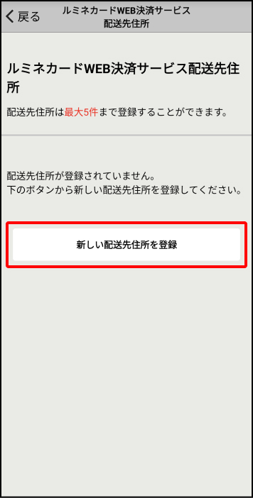 「新しい配送先住所を登録」をタップし、配送先住所を登録するためのフォーム画面へ遷移。
