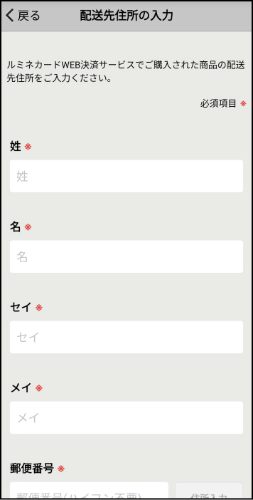 ルミネカードWEB決済サービスにてご購入いただいた商品の配送先住所を入力。