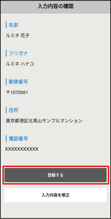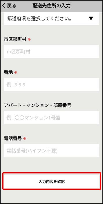 配送先住所の入力後、「入力内容を確認」タップし、入力内容の確認画面へ遷移。