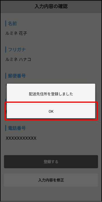 登録が完了するとポップアップが表示され、「OK」をタップ。