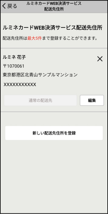 配送先住所の一覧画面に自動で戻り、初回登録時の1件目の住所が自動的に通常の配送先に設定されます。