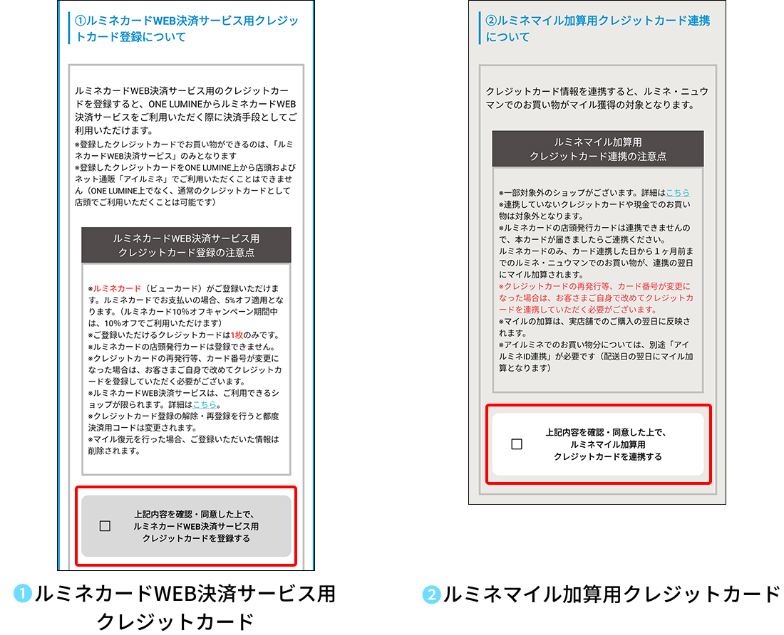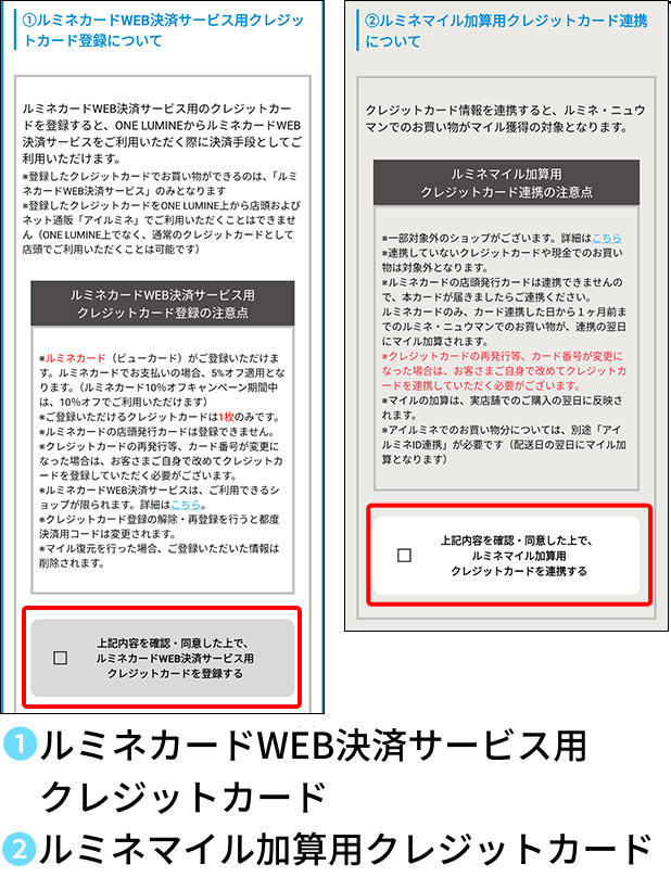 それぞれ注意点を確認し、登録したいクレジットカードにチェックを付けます。同時登録したい場合は、どちらもチェックを付けます。