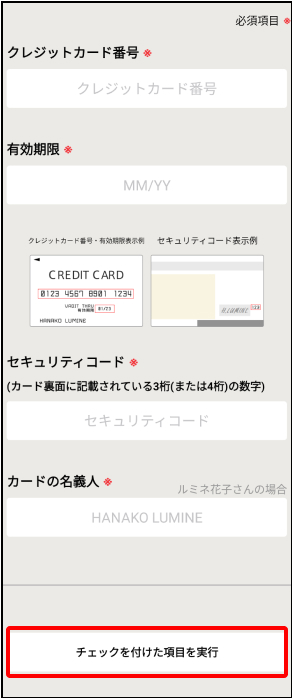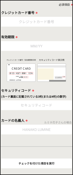 ※ルミネカードWEB決済サービス用クレジットカードを登録する場合は、カードの名義人の入力が必要になります。チェックを付けると、下部の入力欄に名義人欄が追加表示されます。