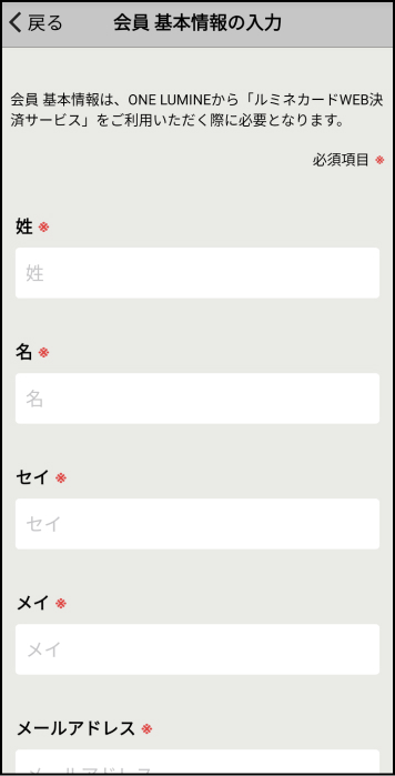 ルミネカードWEB決済サービスをご利用いただくお客さまご自身の必要情報を入力。