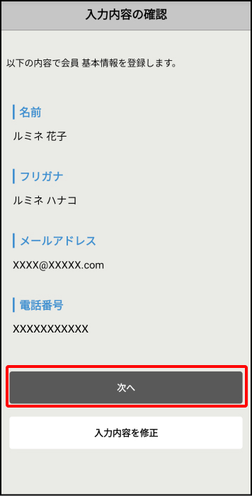 入力内容の確認画面にて、入力情報に間違いがないか確認後、「次へ」をタップ。