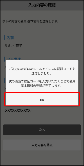 登録が完了するとポップアップが表示され、OKをタップすると会員 基本情報の照会画面に自動で戻ります。