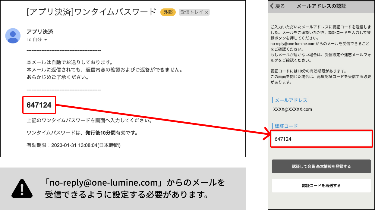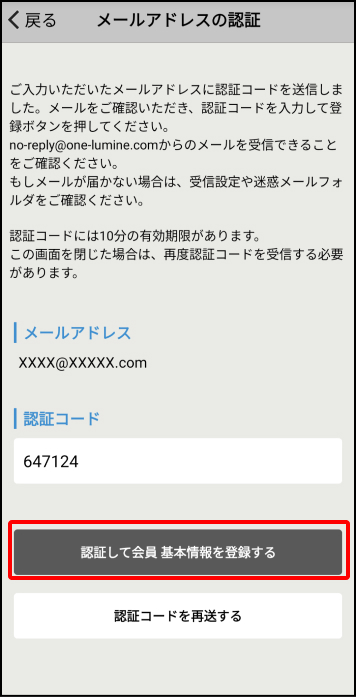 フォーム画面にて入力したメールアドレス宛に認証コード記載のメールが送信されます。ポップアップが表示され、「OK」をタップ。