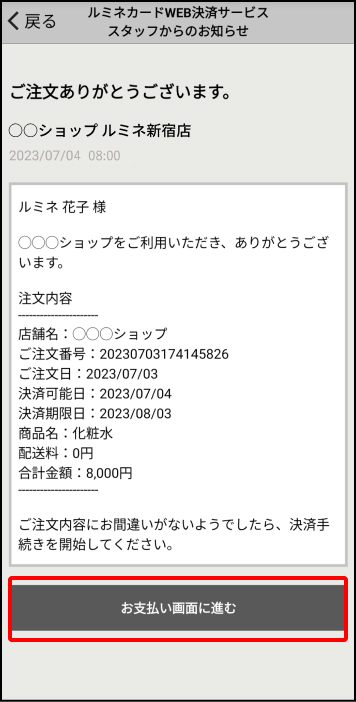 詳細画面下部の「お支払い画面に進む」をタップ。