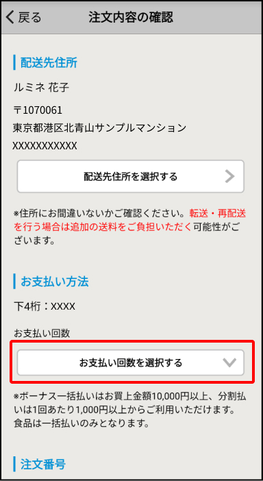 配送先住所を確認し、「お支払い回数を選択する」のボタンをタップし、任意のお支払い回数を選択します。