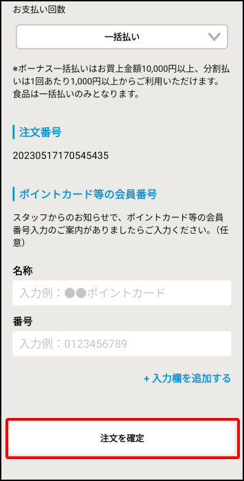※配送先住所とルミネカードWEB決済用クレジットカードが登録されると、「注文を確定」がタップできるようになります。 ※3Dセキュアによる認証が入る場合がございます。