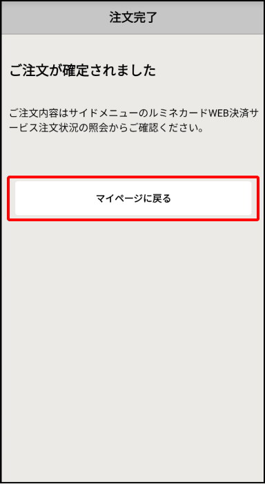 ルミネカードWEB決済用クレジットカードの認証が完了すると、注文完了となり画面が遷移します。